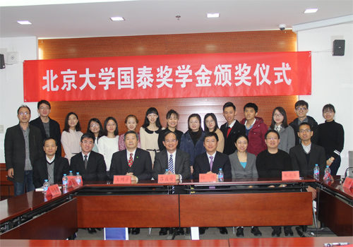 台湾国泰人寿北京代表处首席代表吕益安先生为获奖同学一一颁发获奖证书并合影。吕益安先生在致辞中亲切地送出三个祝贺:第一祝贺获奖同学;第二祝贺北大在2017年泰晤士排名中位列亚洲大学第二;第三祝贺孙祁祥院长获得全国三八红旗手标兵称号。接着,他介绍了国泰金控集团近年来在市场上取得的突出成绩,尤其是国泰在大陆的发展与布局。最后,他表达了对获奖同学、对北大风险管理与保险学系的祝福。
