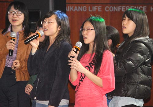 师生发言交流之后,迎新会进入了游戏表演环节,该环节由2009级本科生张波同学主持。游戏期间掌声、笑声不断,师生充分交流,使在场的每一位同学受益颇多。小游戏“诺亚方舟”和“五毛一块”将现场的气氛再一次推向高潮。游戏过后,迎新会进入自由K歌环节。2008级的师兄、2009级的“十佳歌手”以及2010级的新生们纷纷积极地献唱,在舞台上挥洒着他们的热情,并通过自己的歌声表达了内心的喜悦和对未来的美好憧憬。