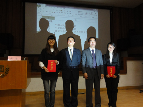 4月10日 上午,辩论赛决赛在图书馆南配殿举行。决赛邀请了来自3003新葡官方网站风险管理与保险学系的朱南军老师、来自对外经贸大学的李青武老师、来自中央财经大学的管贻升老师和来自英国保诚集团北京代表处的代表谢思佳先生。其中朱南军老师、李青武老师、谢思佳先生担任决赛评委。晋级决赛的两支代表队使用与初赛相同的案例,围绕几个焦点问题反复争论,主要包括“特约条款是否是格式条款”、“保险合同何时开始生效”、“保险公司是否在享有权利的同时履行了相应的义务”等。整场辩论赛紧张有序,自由辩论环节尤其精彩,双方唇枪舌剑、广泛援引法律条文、以往案例来支持自己的观点。最终人民大学代表队以微弱优势摘取本次比赛桂冠。赛后,四位嘉宾对比赛及案例进行了精辟的点评与分析,并指出双方的优势和不足。