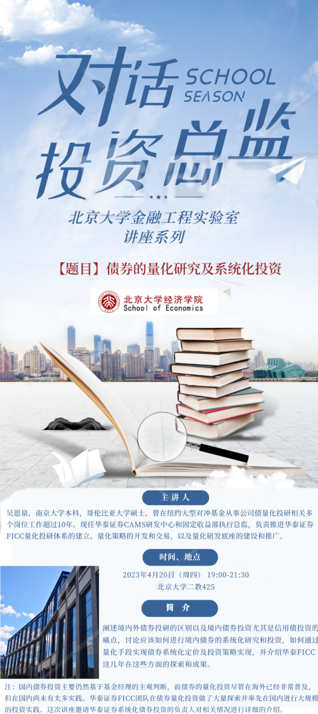 主讲人简介: 吴恩泉,南京大学本科,哥伦比亚大学硕士。曾在纽约大型对冲基金从事公司债量化投研相关多个岗位工作超过10年。现任华泰证券CAMS研发中心和固定收益部执行总监,负责推进华泰证券FICC量化投研体系的建立、量化策略的开发和交易,以及量化研发底座的建设和推广。