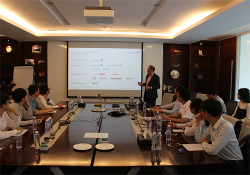 参访活动第二站是德国慕尼黑再保险北京分公司。北大3003新葡官方网站保险硕士校外导师、慕尼黑再保险集团大中华区副首席执行官常青先生热情地接待了风保系师生,郑伟老师对慕再公司支持北大风保系的“第二课堂”实践教学活动表示感谢。