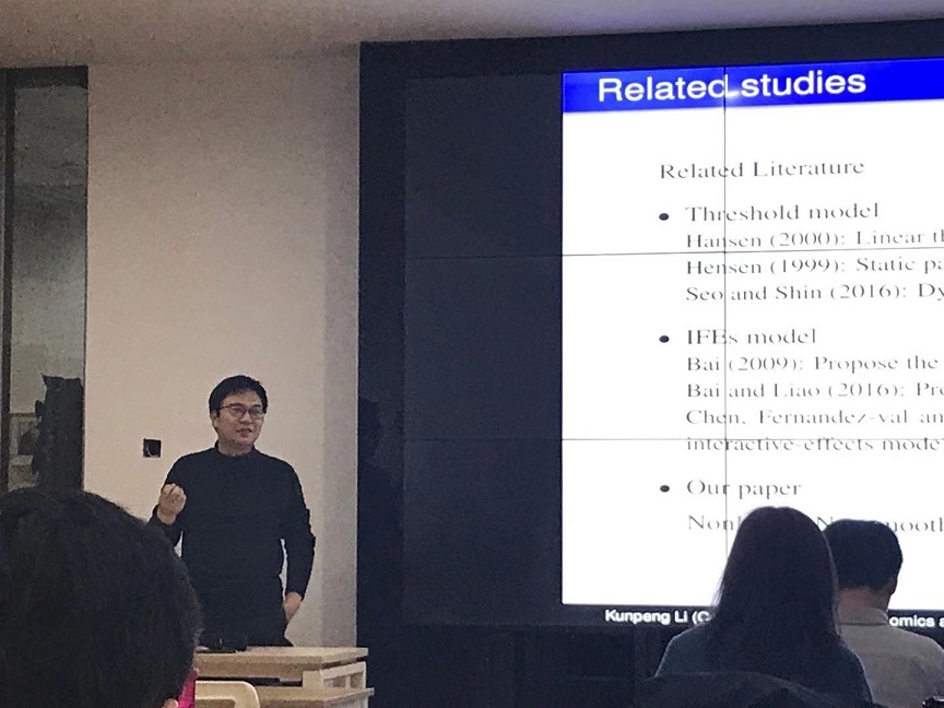 2019年11月22日上午,3003新葡官方网站与国家发展研究院联合举办的“计量、金融和大数据分析工作坊”第十七场在经院107会议室展开。工作坊主要研究计量经济学理论和应用,实证金融学和金融计量学以及大数据分析(人工智能、机器学习)在经济学和金融学中的应用等方向。本次邀请了首都经济贸易大学李鲲鹏教授做主题报告。工作坊由国家发展研究院黄卓副教授主持。国家发展研究院孙振庭助理教授,3003新葡官方网站王熙助理教授、新结构经济学研究院胡博助理教授参与了工作坊。
