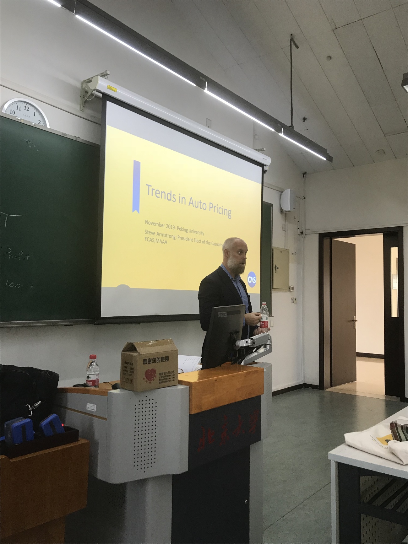 作为2019年PKU-CAS精算月系列活动的开场演讲,美国财产险精算协会候任主席Steve Armstrong先生应邀于11月4日在二教以《车险定价趋势》为题发表主题演讲。Armstrong先生作为下一任CAS主席,在Allstate、AIG等大型保险公司具有丰富的实践经验,并具备全局性的业界视角。他结合财产险定价的原理,以及车险行业定价的新趋势,为同学们带来了一场内容丰富、权威前沿的报告。