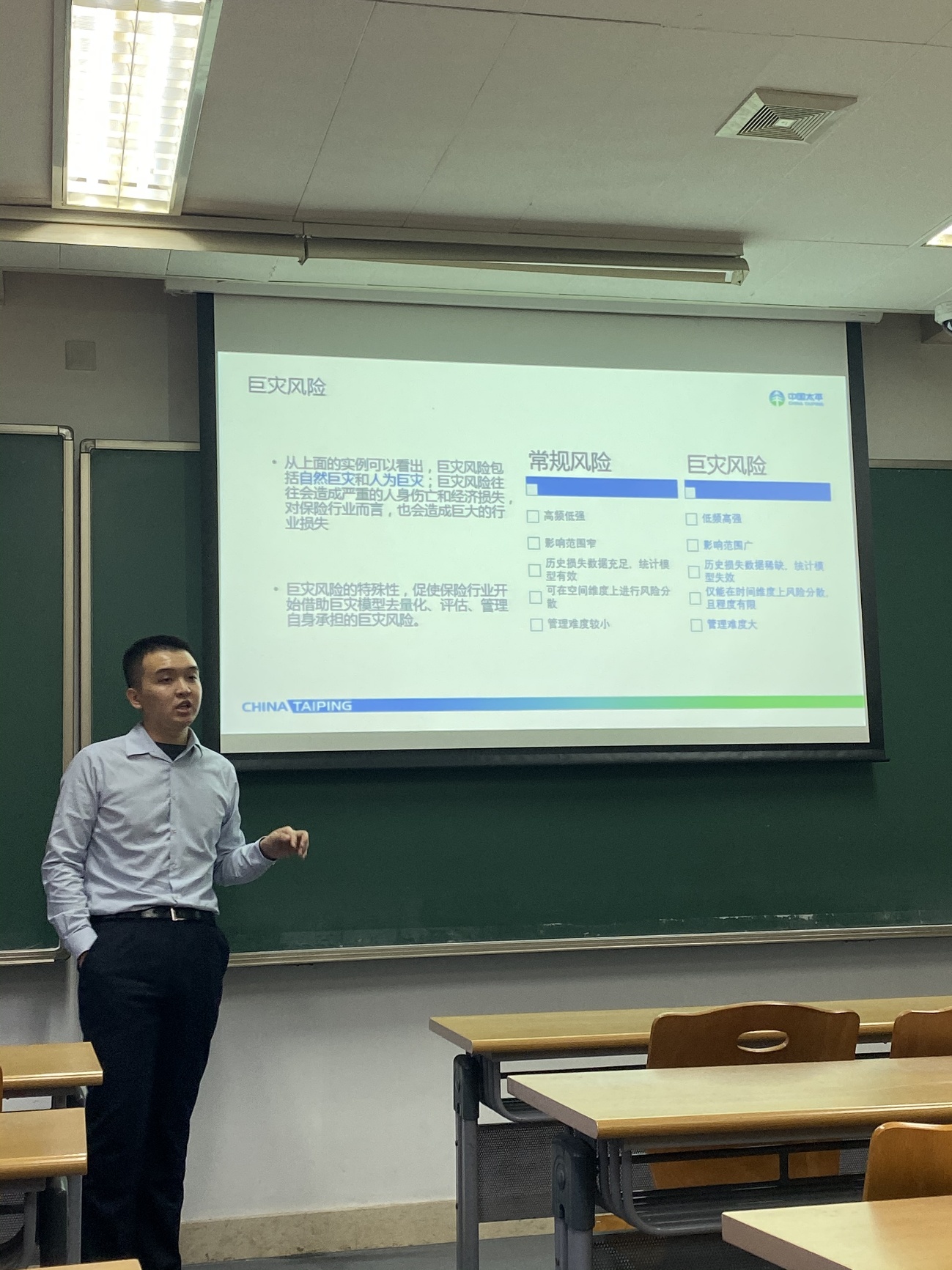 PKU-CAS精算月系列活动的第三场讲座于11月13日举行,由太平再保险有限公司合约业务核保人李皞先生主讲《再保险市场和巨灾模型》。李皞先生首先介绍了再保险的定义、分类,以及我国相关法律法规对原保险公司购买再保险的规定。其后,他介绍了再保险市场中的参与者,并对国内外再保险市场的历史、发展现状以及发展趋势做了概述。在此基础上,他介绍了基础的再保险产品定价方法。随后,李皞先生从巨灾风险与巨灾模型的定义、巨灾模型的输入与输出、巨灾模型的提供方与使用方等方面向同学们简要介绍了相关知识。巨灾保险与其他的保险不同,巨灾发生的概率和它造成损失难以估计,这使得跨学科复合背景的人才团队参与研究凸现出其特有价值。