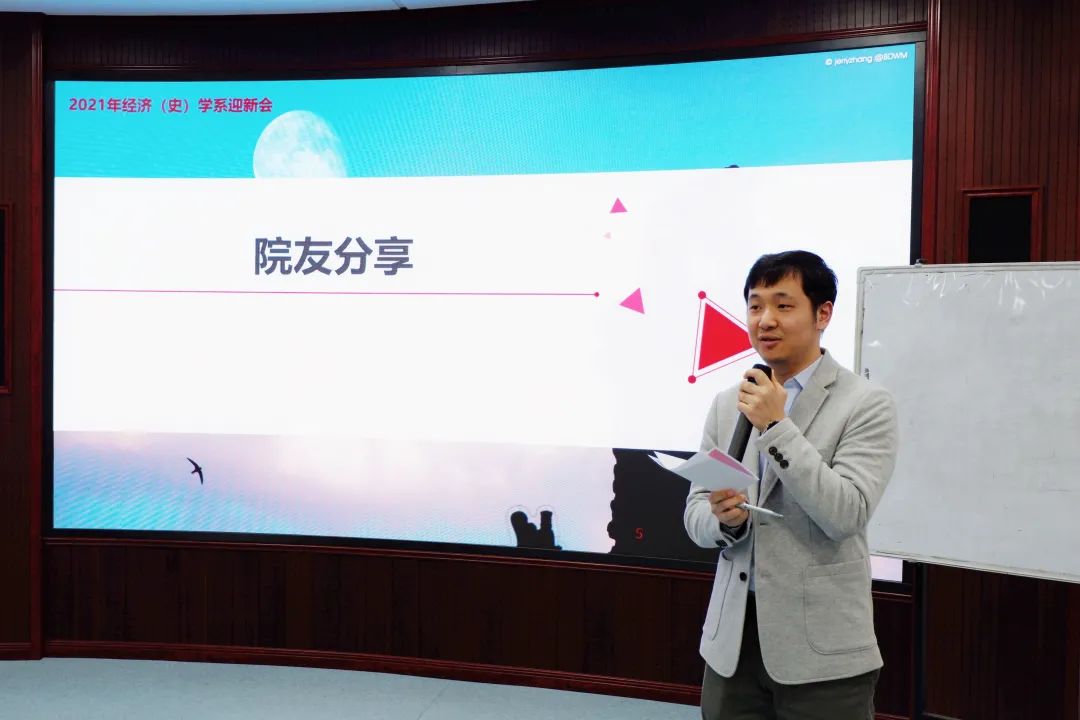 在校友分享环节,周彭校友表示在经济学系的学习能够让同学保持宽视野、培养经济学直觉,有助于未来的工作,并鼓励大家积极参与集体活动,同时实事求是,正确认识自己。吕麒校友回忆了自己在经济系六年的学习经历,以及自己对经济系强烈的归属感。他认为在积淀深厚的经济系的学习能够提供一个贯穿古今中外的坐标系,从而去更好地做出判断。范雯琪校友建议同学们在试错成本较低的时候去了解自己的喜好并且不断锻炼自己的能力,为求职做好准备,并且要学会使用辩证法的观点来处理学习工作中的问题。房誉校友则结合了自己在香港工作的经历,表示在经济学系学习的不同思想流派的逻辑方法将在未来指导同学们的工作和生活,这就是在经济学系学习的底蕴。