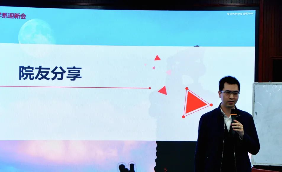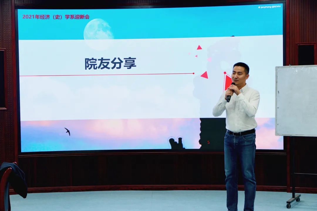 首先张辉致辞。他对加入经济学系的2019级的同学们表示欢迎。张辉提出,经济学系有着深厚的历史积淀和传承,学习内容集现代理论、实证方法与历史于一体,进入经济学系将会是同学们正确的选择;同时,他鼓励同学们在学校里扩大自己生活、学习的空间,多做尝试,让自己的生活更加丰富多彩。最后,张辉欢迎和感谢四位校友回校与师弟师妹们分享学习工作上的经验,也诚挚邀请所有的校友常回家看看。