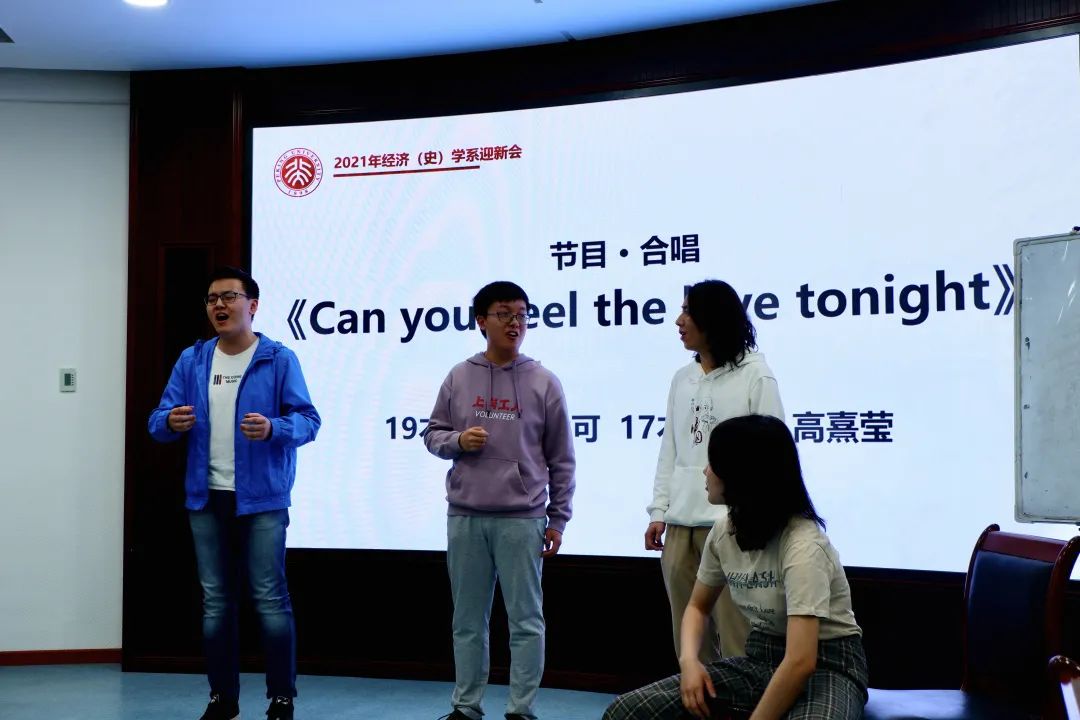 随后,老生代表用精彩的节目欢迎新同学们加入经济学系,2017级本科生李子安、高熹莹和2019级本科生唐浴歌、徐可带来合唱《Can You Feel the Love Tonight》;2018级本科生宫凯进行了京剧表演。精彩的节目引发了大家热烈的掌声。